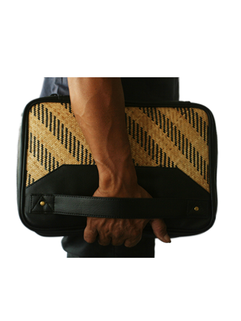 Laptop Bag, rectangular shape, vinyl and rattan wicker material, Borneo motif, black and natural color.