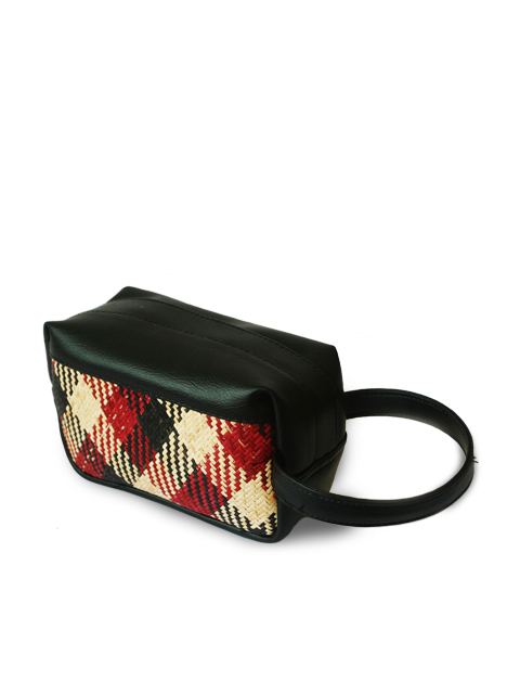 Pouch, rectangular shape, vinyl and rattan wicker material, black-red and natural colors.