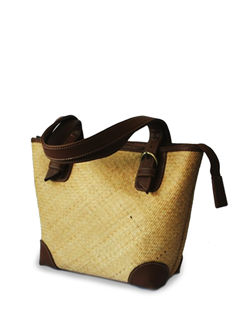 Apikri handmade Tote Bag, trapezoidal shape, vinyl and rattan wicker material, dark brown and natural color.