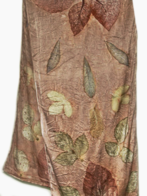 This natural brown Eco Print scarf is made from a mixture of viscose. This scarf has various leaf motifs, as well as a brown background, the edges are rolled up.