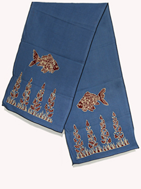 Scarf, cotton fabric material, handwritten batik technique, leaf and fish motif batik, sky blue color background, neci(wolsum) hem edge.