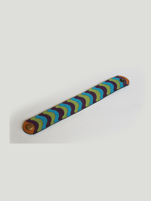 This bracelet is made of leather with curved motifs, black, purple, green, turquoise and brown.