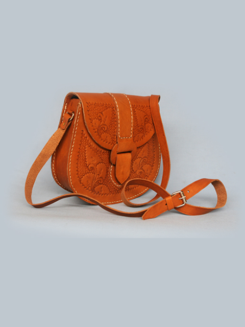 Leather bag, size XL, guitar oval shape, inlay technique, floral and dot pattern front. The back is a bird, dot and flower motif, light brown leather, the inside is a truntum batik cotton fabric.