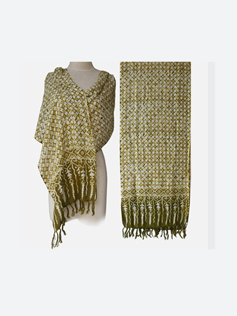 Scarf, cotton material, kawung and tumpal motif batiked, green and white color.