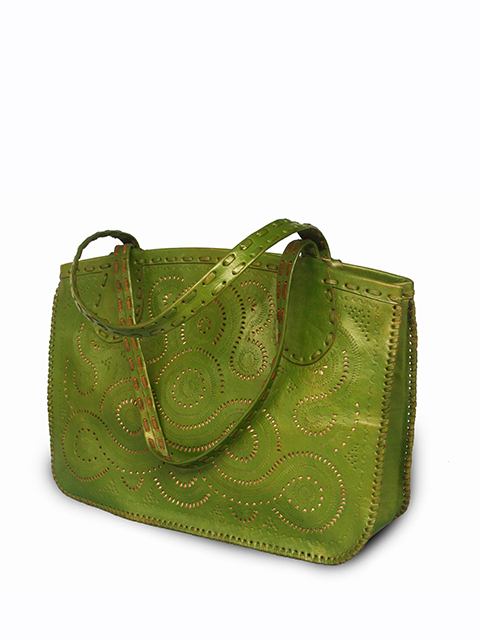 Apikri handmade Leather bag, inlaid motif, two handles, dark green color.