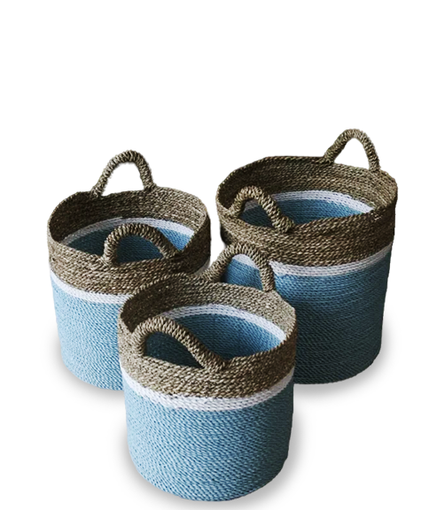 Apikri Handmade Basket, Sea grass material, cylinder shape, blue and natural color, without coating, available set-3 and set-4.