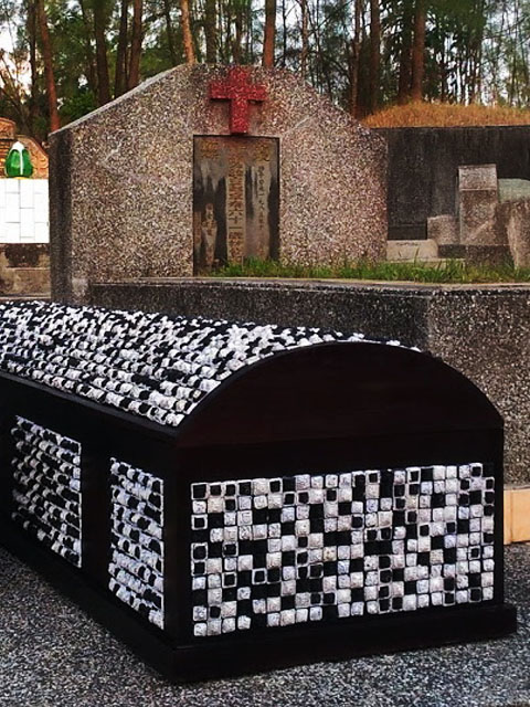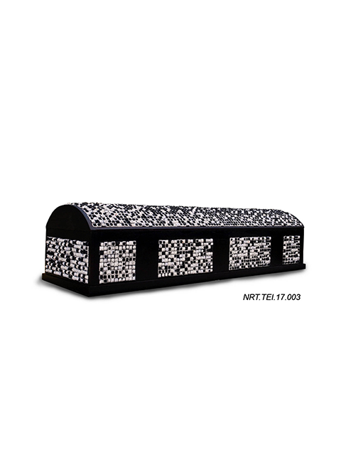 This casket, rectangular in shape and curved coffin lid is made from a combination with recycled magazine covers. the shade of the frame has a dark brown color, with a Nitrocellullose coating system.
