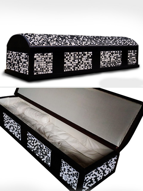 Coffin, rectangle shape and lid of curved coffin, combination with recycle magazine cover, dark brown frame shade, Nitrocellullose coating system.